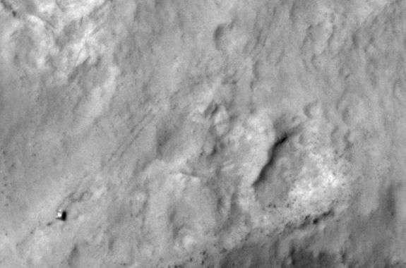 Два новых снимка Curiosity сделаны 11 декабря 2013 года камерой HiRISE (High Resolution Imaging Science Experiment Камера для научных экспериментов с высоким разрешением), которая установлена на борту Mars Reconnaissance Orbiter. Здесь можно увидеть один из этих снимков.